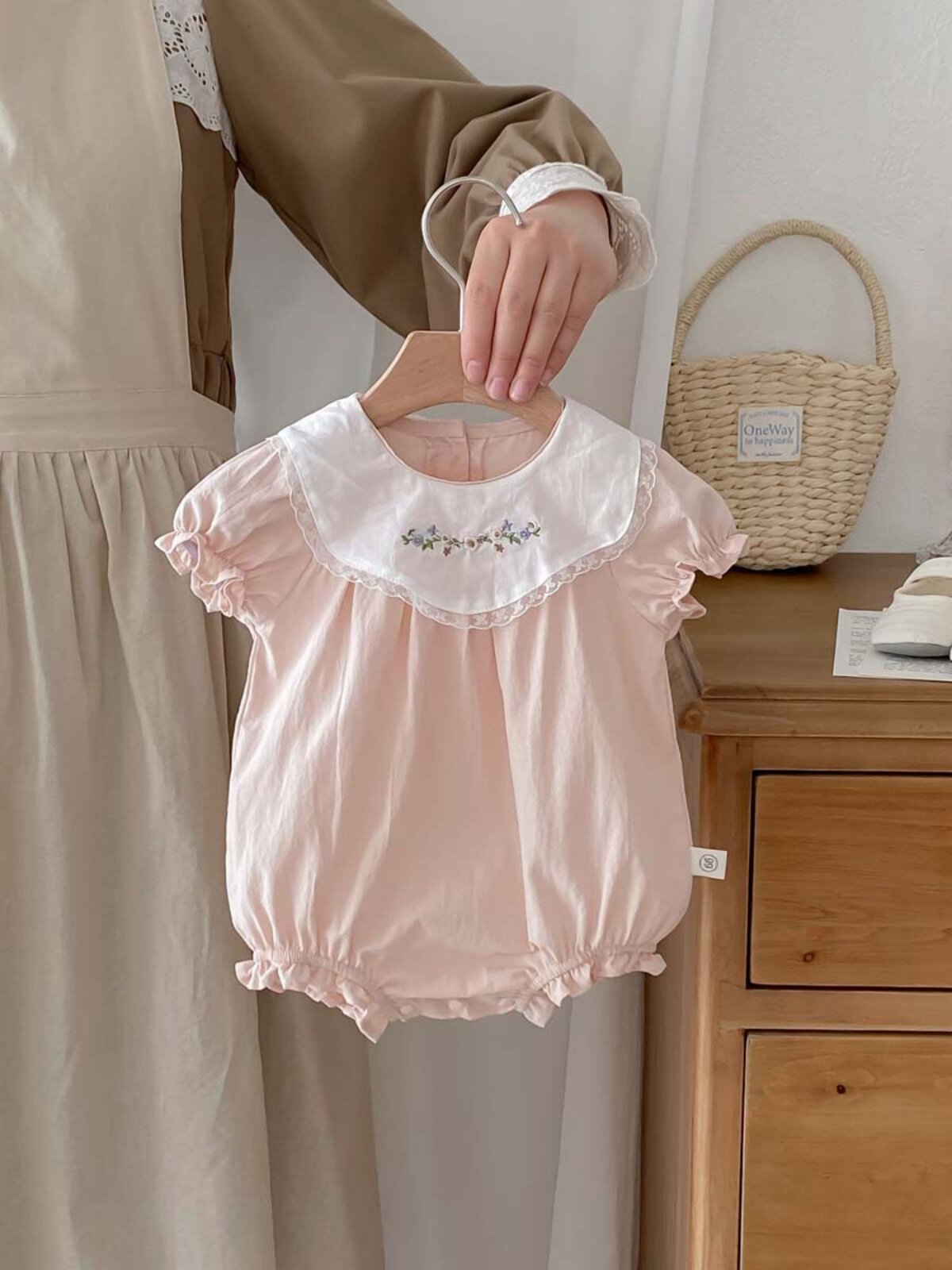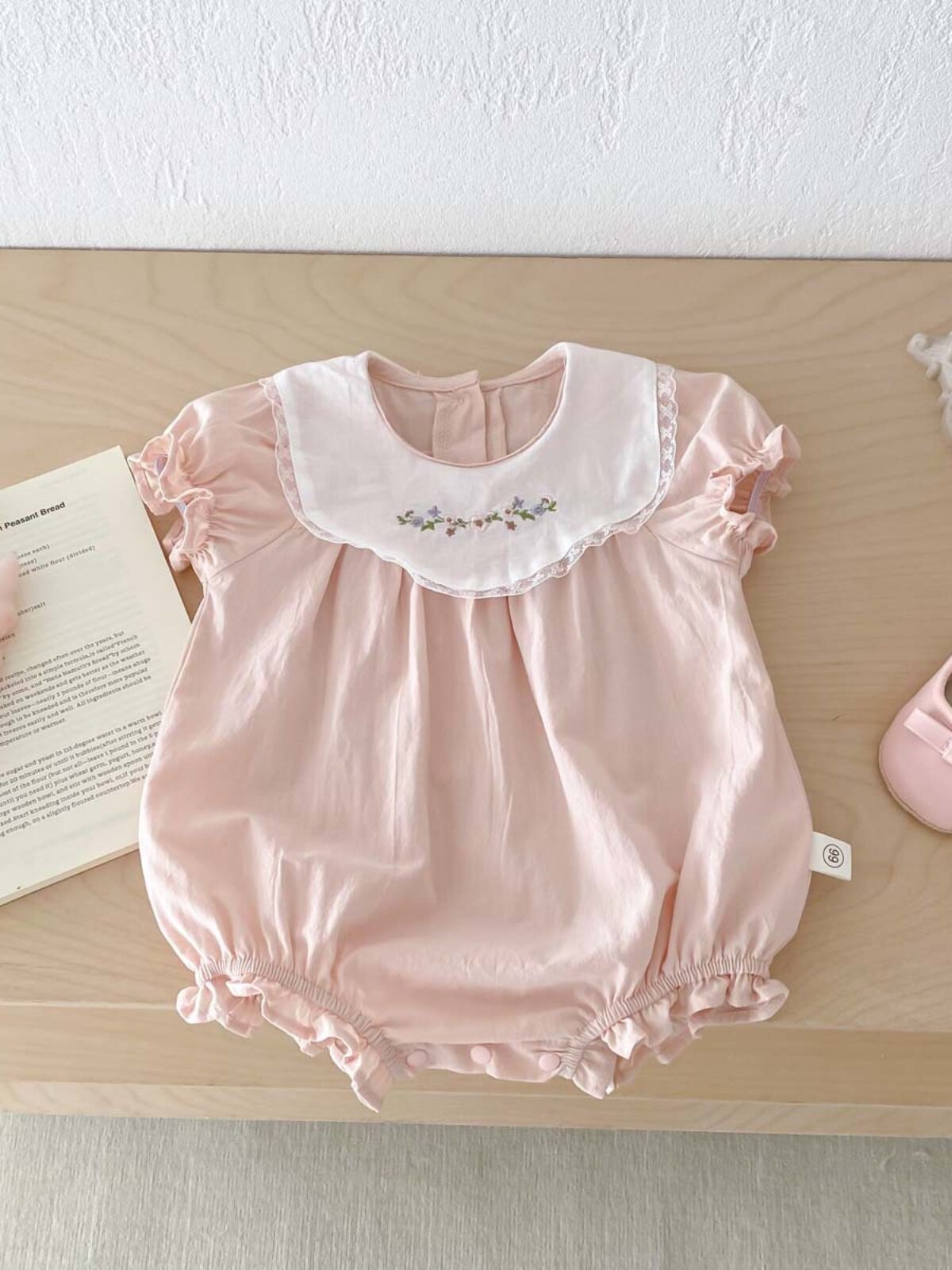 優しい雰囲気の半袖ロンパースです。 丸襟には可憐な小花の刺繍とレースがあしらわれ、クラシカルで上品な印象を演出します。 袖口と裾はフリルデザインになっており、女の子らしい愛らしさが魅力です。 やわらかな素材で赤ちゃんの肌に優しく、おむつ替えもスムーズに行えます。 お出かけや記念撮影にもぴったりのロンパースです。